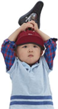 サドルだけだって⼦どもにとっては⽴派な遊び道具。頭に乗っければお侍さんに変⾝。きちんとまっすぐ載せられるかな。